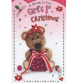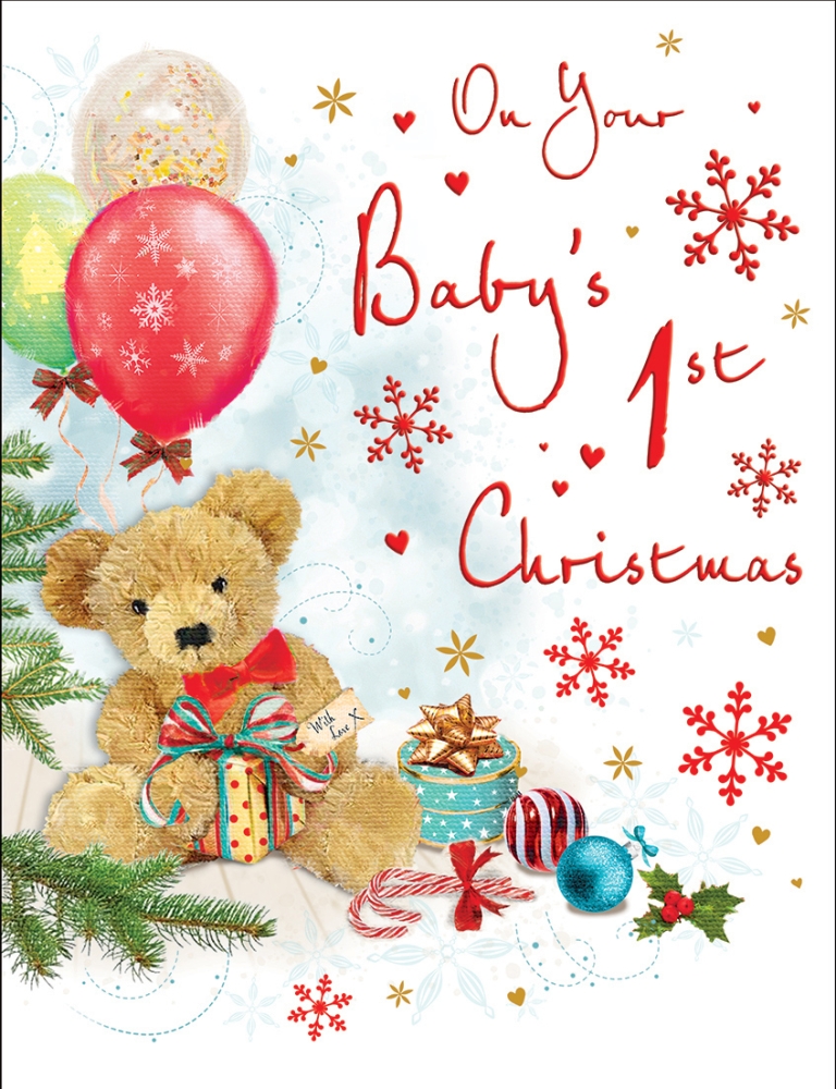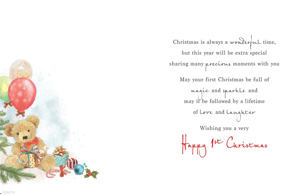 Verse reads: Christmas is always a wonderful time, but this year will be extra special sharing many precious moments with you May your first Christmas be full of magic and sparkle and may it be followed by a lifetime of love and laughter Wishing you a very Happy 1st Christmas