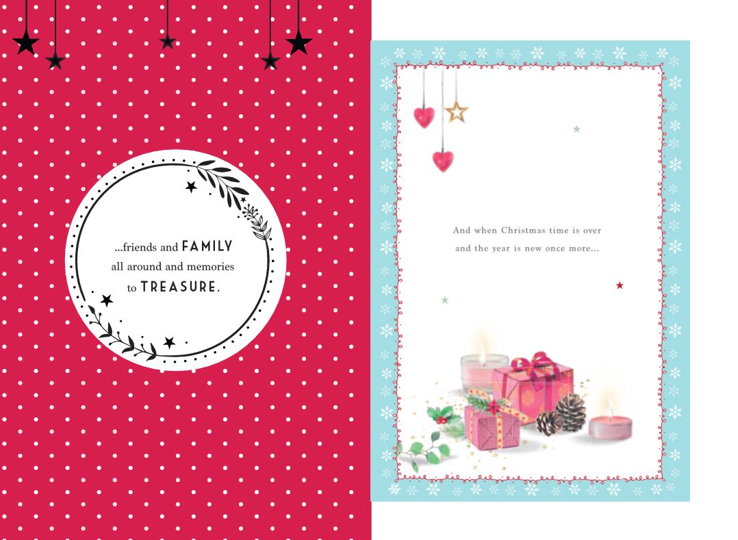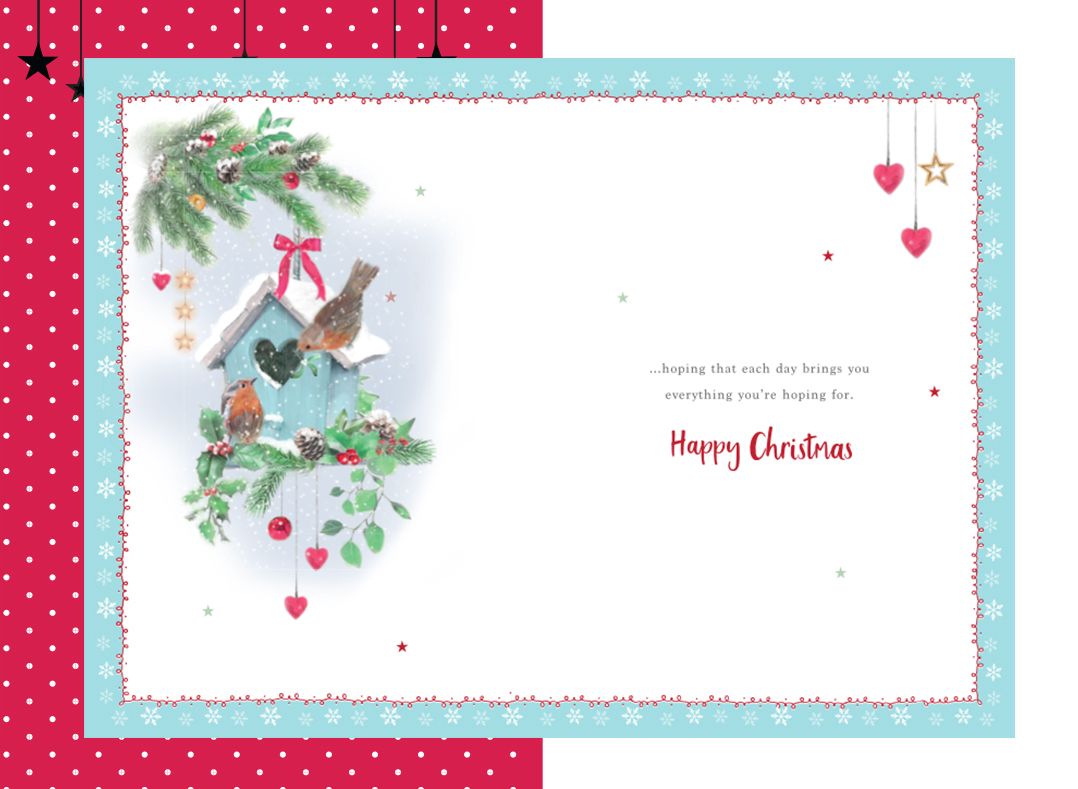 Verse reads: Front - A Christmas wish is made for you both for a holiday full of pleasure... Inside - ...friends and family all around and memories to treasure. And when Christmas time is over and the year is new once more... ...hoping that each day brings you everything you're hoping for. Happy Christmas