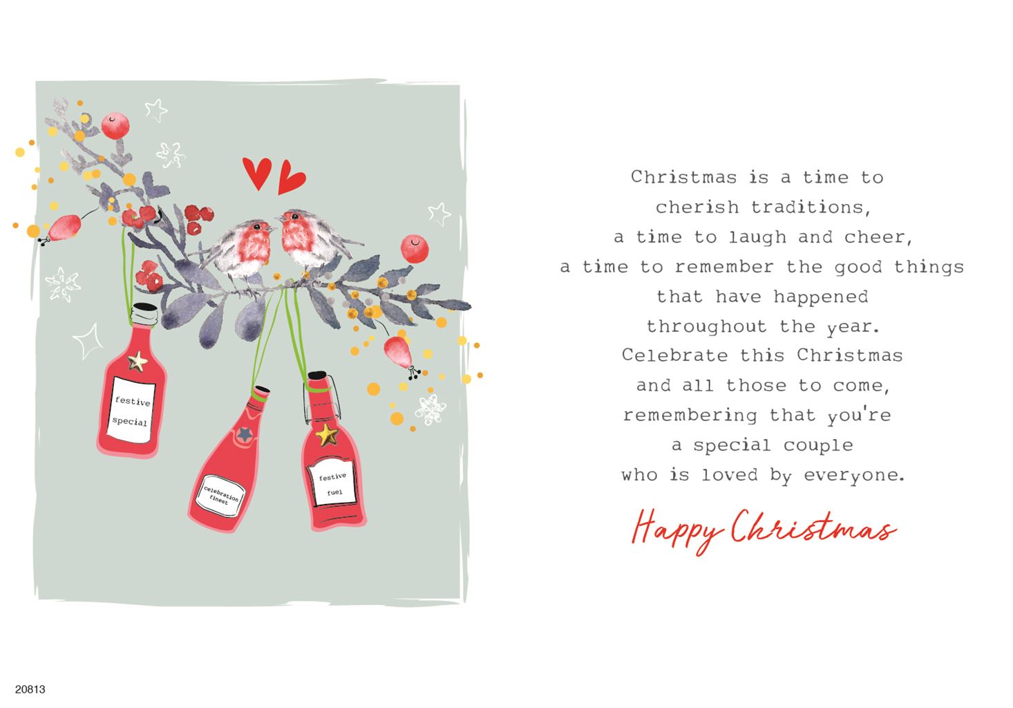 Verse: Christmas is a time to cherish traditions, a time to laugh and cheer, a time to remember the good things that have happened throughout the year. Celebrate this Christmas and all those to come, remembering that you're a special couple who is loved by everyone. Happy Christmas