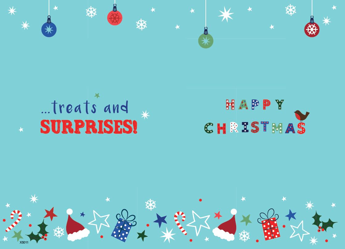 Verse reads: Front - Wishing you a Christmas full of fun, laughter... Inside - ...treats and surprises! Happy Christmas