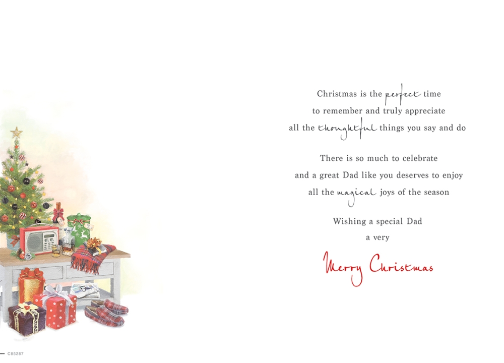 Verse reads: Christmas is the perfect time to remember and truly appreciate all the thoughtful things you say and do There is so much to celebrate and a great Dad like you deserves to enjoy all the magical joys of season Wishing a special Dad a very Merry Christmas