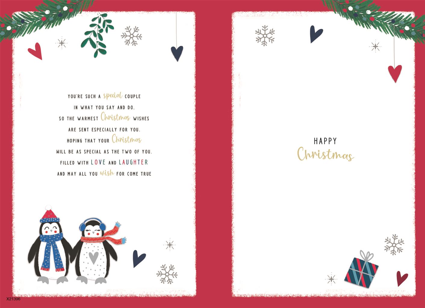 Verse: You're such a special couple in what you say and do, so the warmest Christmas wishes are sent especially for you. Hoping that your Christmas will be as special as the two of you, filled with love and laughter and may all you wish for come true. Happy Christmas
