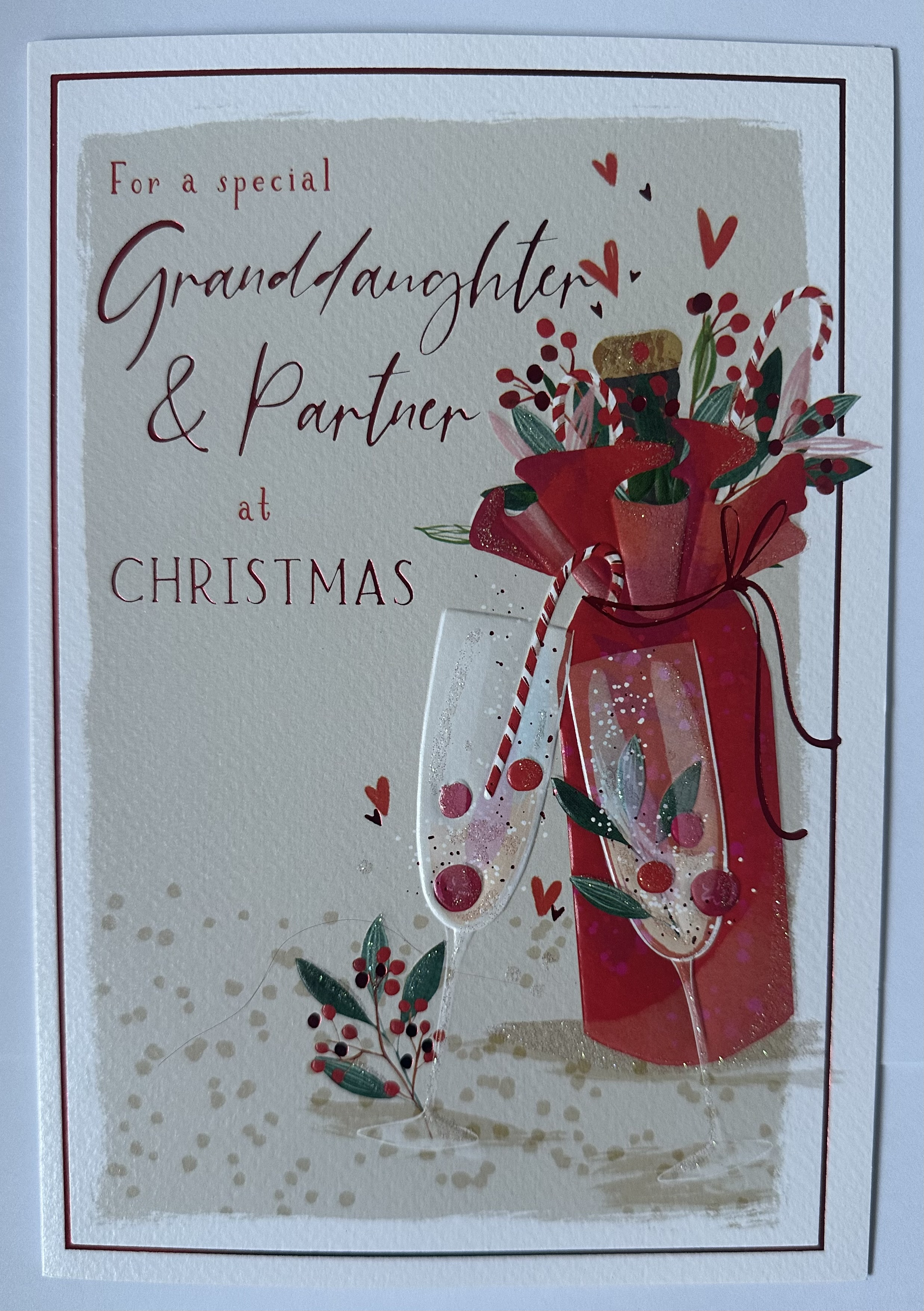 Granddaughter and Partner Christmas Card - Red Bottle Wrap - Glasses