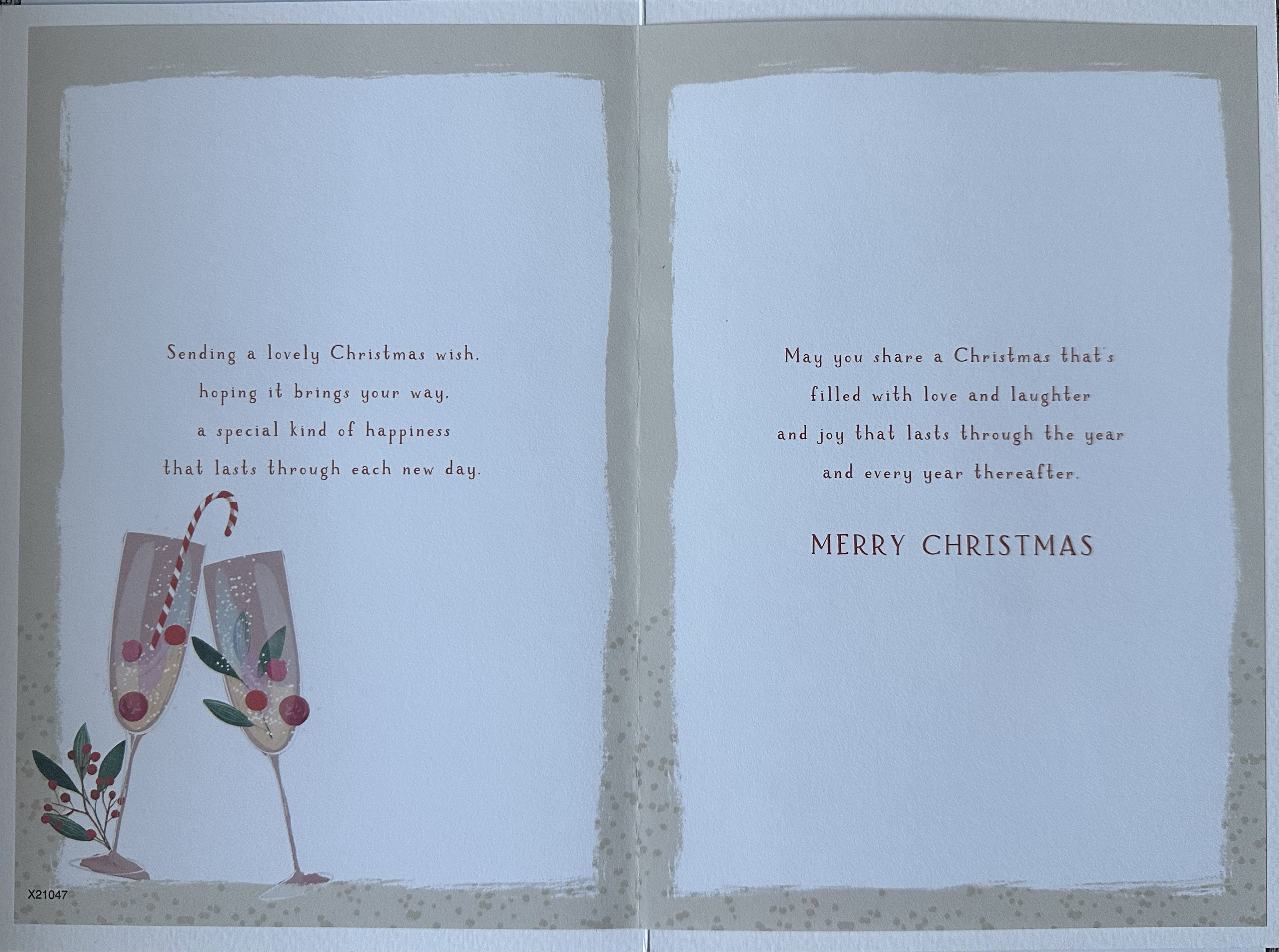Verse: Sending a lovely Christmas wish, hoping it brings your way a special kind of happiness that lasts throughout each day. May you share a Christmas that's filled with love and laughter and joy that lasts through the year and every year thereafter. Merry Christmas