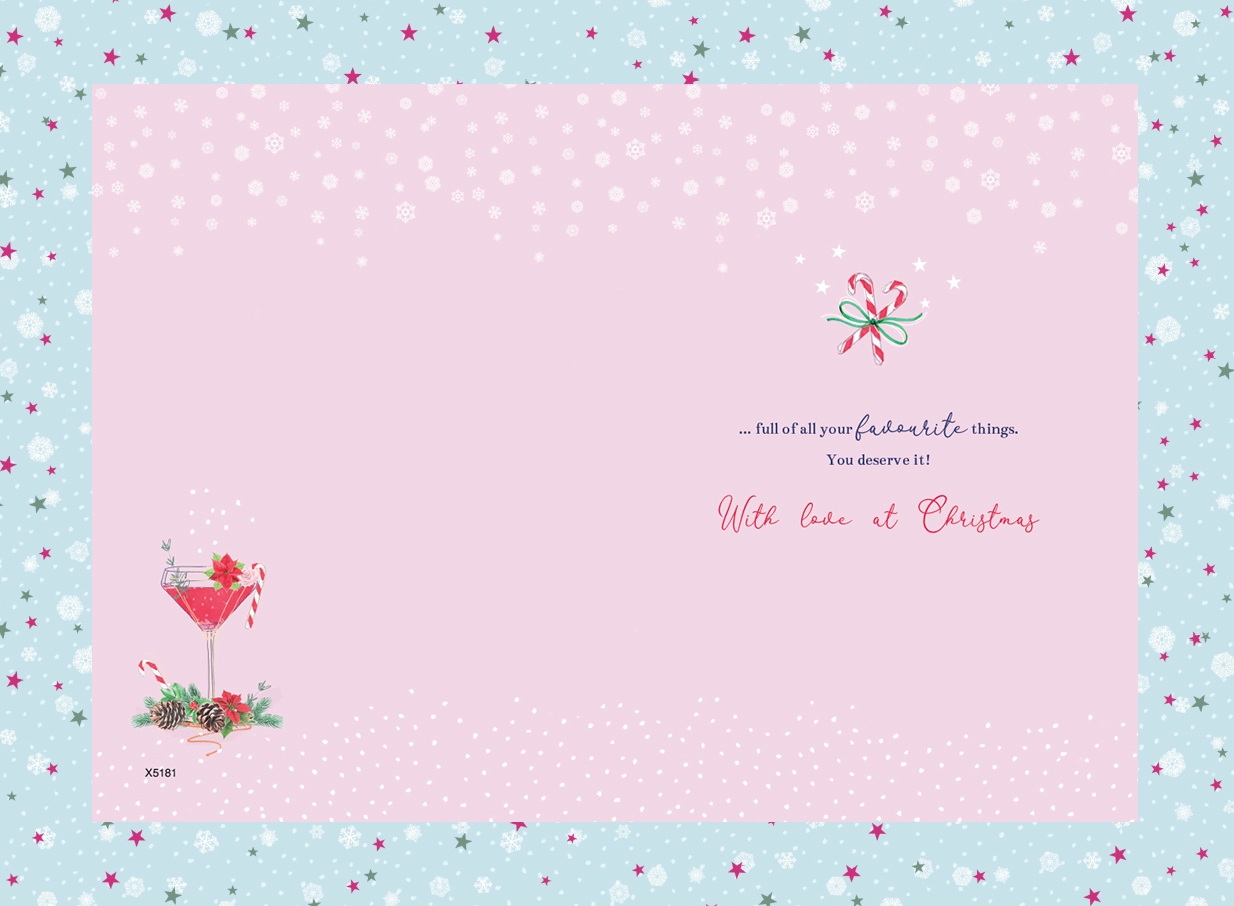Verse reads: Front... Have yourself a merry little Christmas...full of all your favourite things. You deserve it! With Lots of love at Christmas