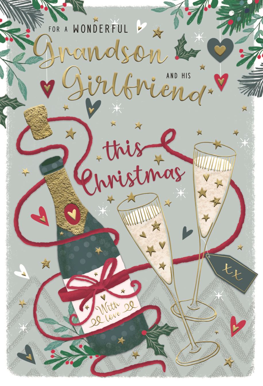 Grandson and Girlfriend Christmas - Bottle and Two Glasses - Red String
