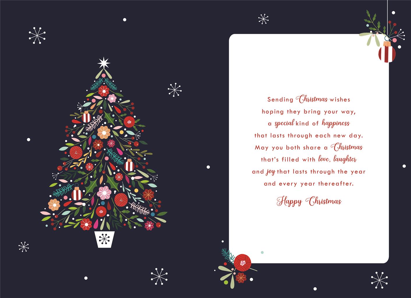 Verse: Sending Christmas wishes hoping they bring your way, a special kind of happiness that lasts through each new day. May you both share a Christmas thats filled with love, laughter and joy that lasts through the year and every year thereafter. Happy Christmas