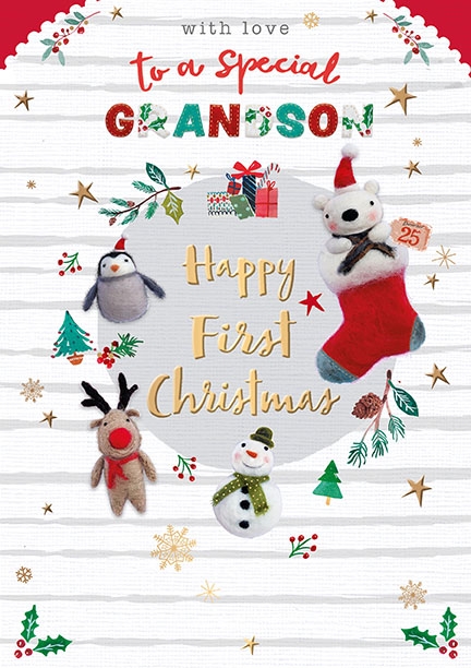 Verse reads: You're such a special Grandson and this wish is on its way, To bring you lots of happiness and fun on Christmas Day. Happy 1st Christmas to a very special Grandson