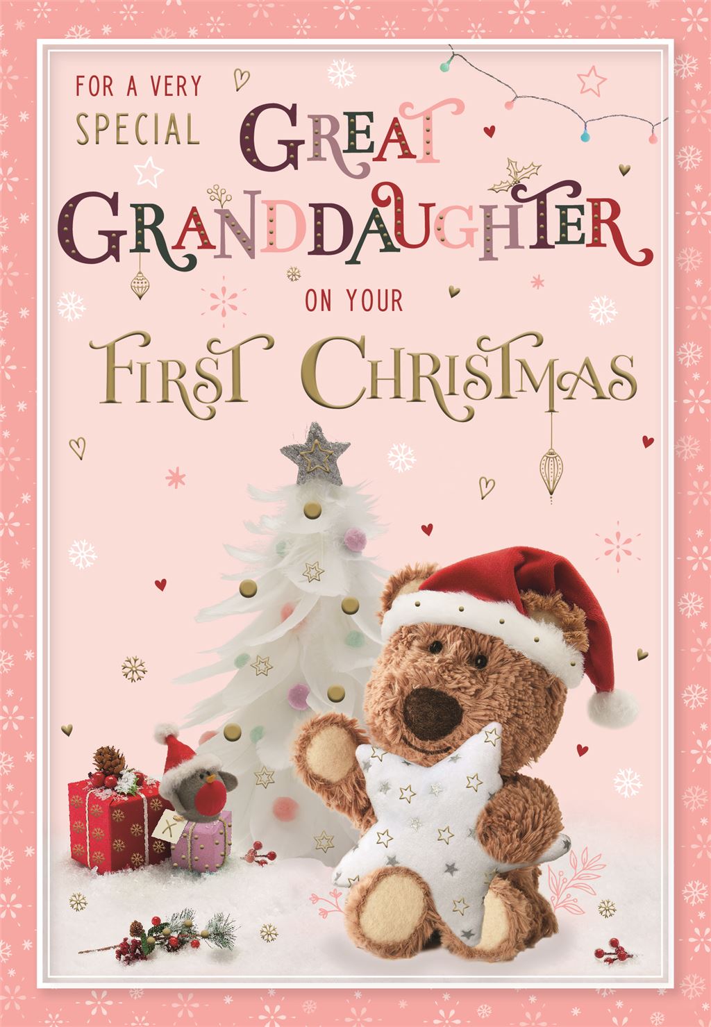 Great Granddaughter First Christmas Card - Barley Bear - White Star