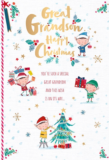 Verse reads: Front - You're such a special Great Grandson and this wish is on its way... Inside - To bring you lots of happiness and fun on Christmas day! Happy Christmas to a very special Great Grandson
