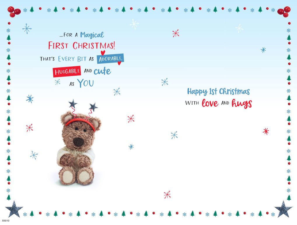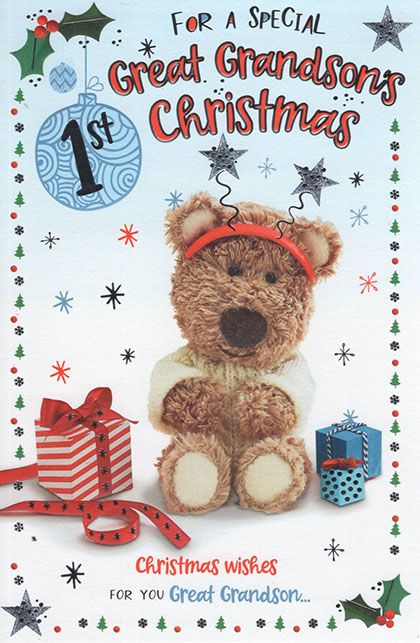 Verse reads: Front - Christmas wishes for you Great Grandson... Inside - ...For a magical first Christmas! That's every bit as adorable, huggable and cute as you Happy 1st Christmas with love and hugs