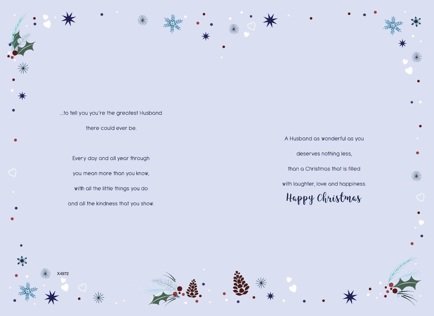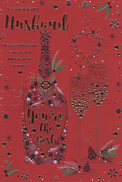 Verse reads: Front - This special message comes to you with lots of love from me, Inside - ...to tell you you're the greatest Husband there could ever be. Every day and all year through you mean more than you know, with all the little things you do and all the kindness that you show. A Husband as wonderful as you deserves nothing less, than a Christmas that is filled with laughter, love and happiness. Happy Christmas