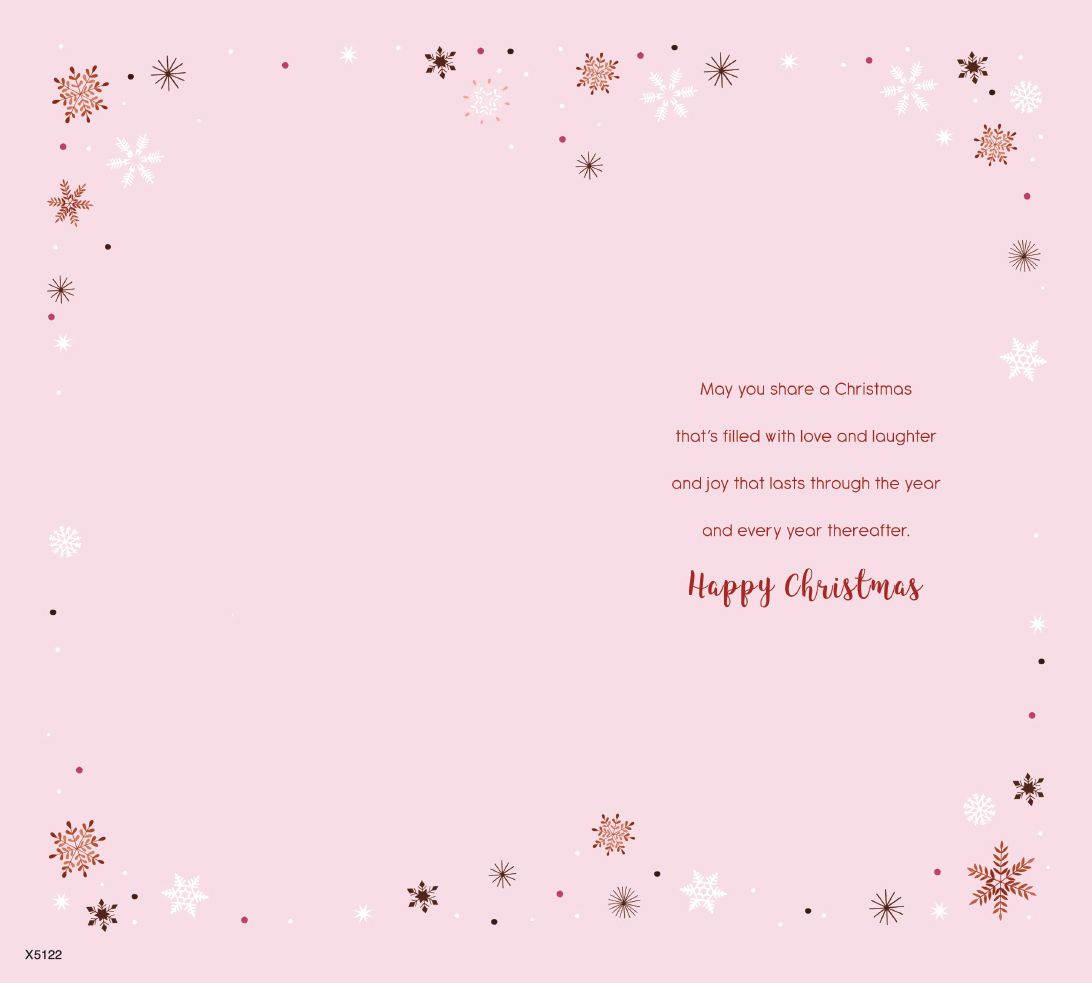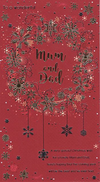 Verse reads: Front - A very special Christmas wish for a lovely Mum and Dad, here's hoping that the coming year will be the best you've ever had. Inside - May you share a Christmas that's filled with love and laughter and joy that lasts through the year and every year thereafter. Happy Christmas