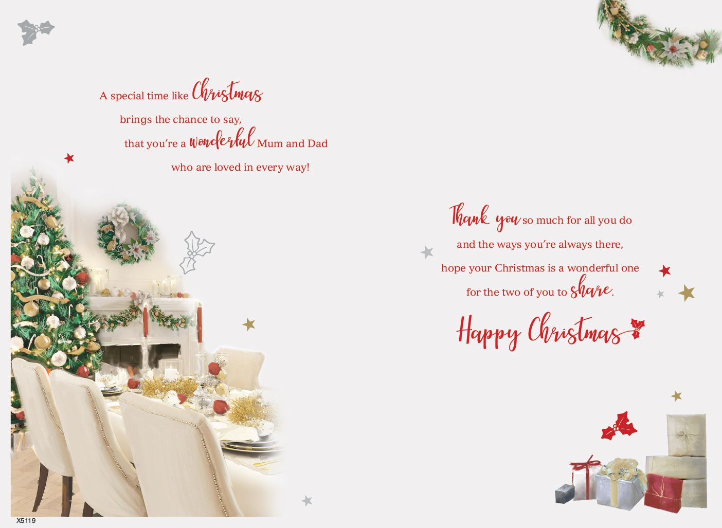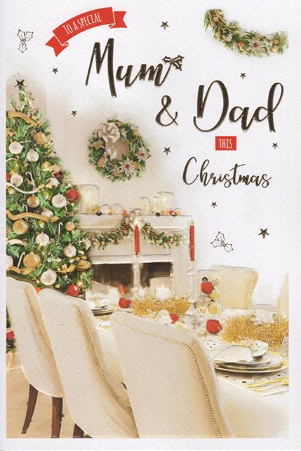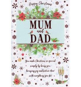 Verse reads: A special time like Christmas brings the chance to say, that you're a wonderful Mum and Dad who are loved in every way! Thank you so much for all you do and the ways you're always there, hope your Christmas is a wonderful one for the two of you to share. Happy Christmas