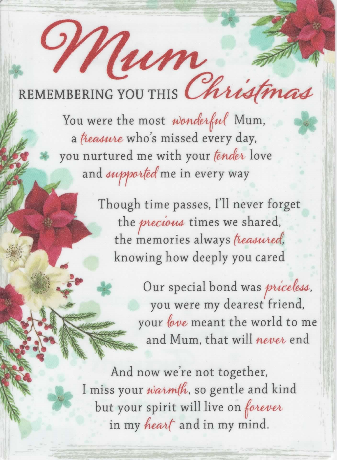 Verse reads: You were the most wonderful Mum, a treasure who's missed every day, you nurtured me with your tender love and supported me in every way Though time passes, I'll never forget the precious times we shared, the memories always treasured, knowing how deeply you cared Our special bond was priceless, you were my dearest friend, your love meant the world to me and Mum, that will never end And now we're not together, I miss your warmth, so gentle and kind but your spirit will live on forever in my heart and in my mind.