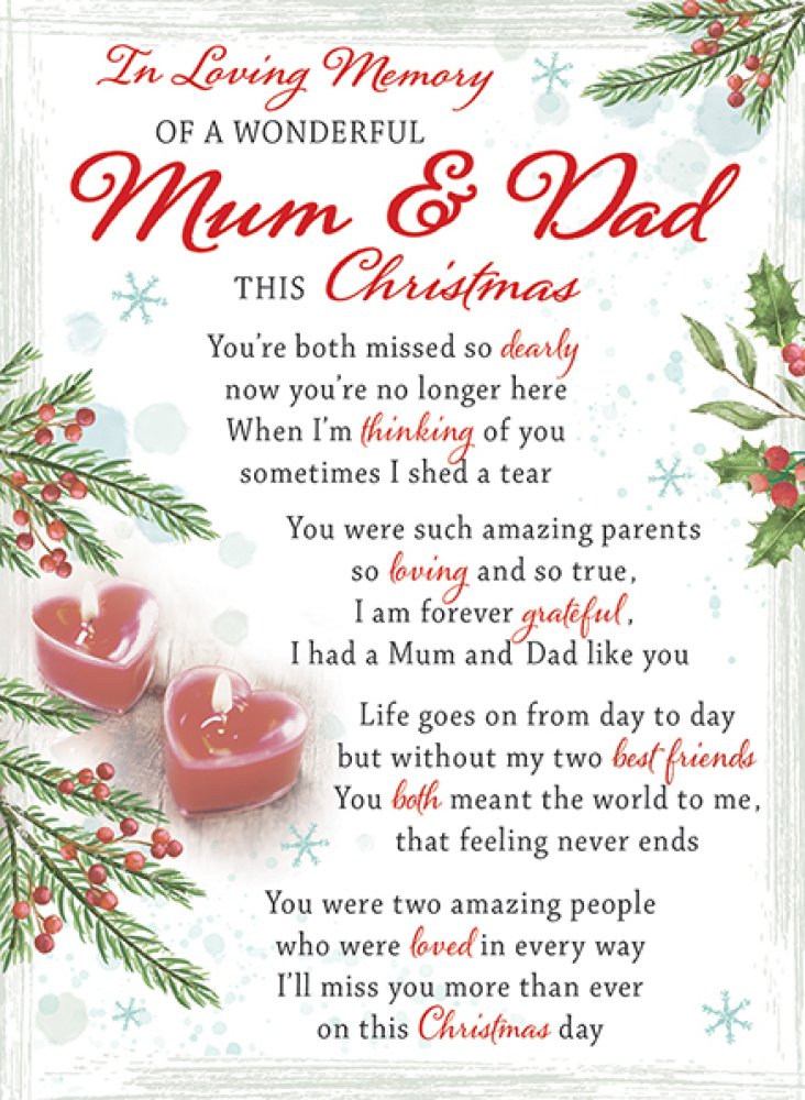 Verse reads: You're both missed so dearly now you're no longer here When I'm thinking of you sometimes I shed a tear You were such amazing parents so loving and so true, I am forever grateful, I had a Mum and Dad like you Life goes on from day to day but without my two best friends You both meant the world to me, that feeling never ends You were two amazing people who were loved in every way I'll miss you more than ever on this Christmas day