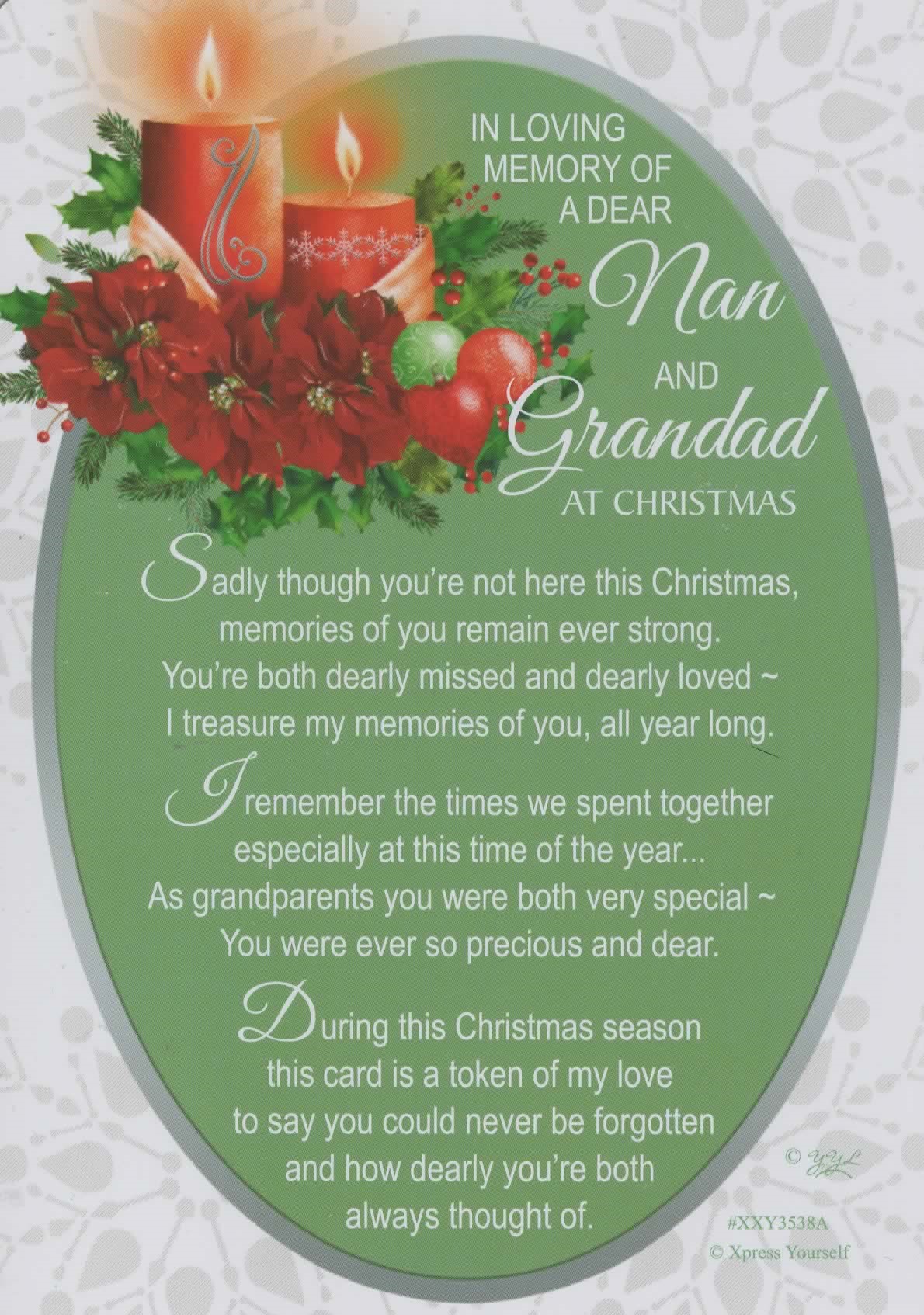 Verse: Sadly though you're not here this Christmas, memories of you remain ever strong. You're both dearly missed and dearly loved ~ I treasure my memories of you, all year long. I remember the times we spent together especially at this time of the year... As grandparents you were both very special ~ You were ever so precious and dear. During this Christmas season this card is a token of my love to say you could never be forgotten and how dearly you're both always thought of.