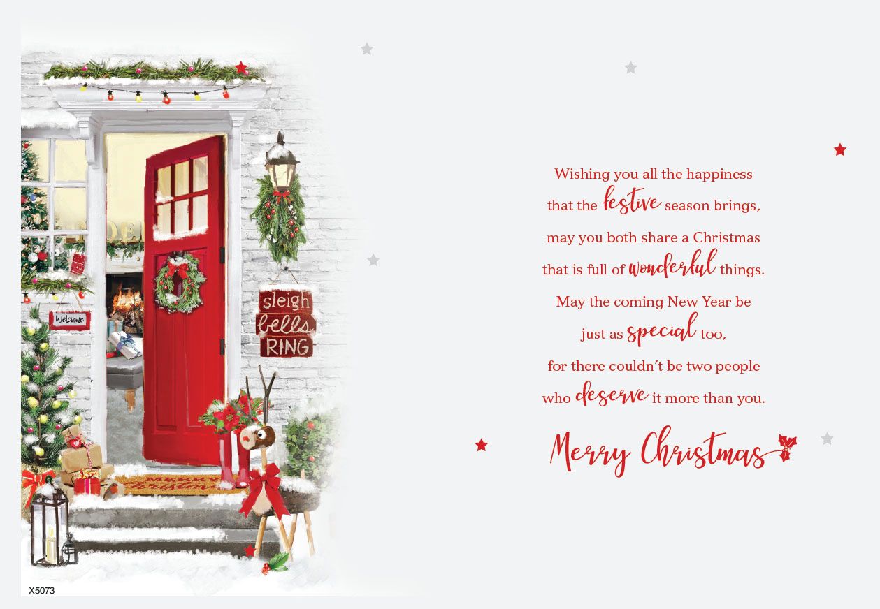 Verse reads: Wishing you all the happiness that the festive season brings, may you both share a Christmas that is full of wonderful things. May the coming New Year be just as special too, for there couldn't be two people who deserve it more than you. Merry Christmas