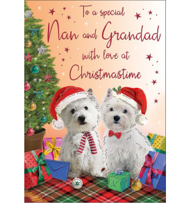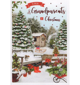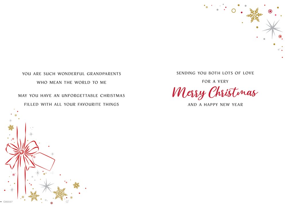 Verse reads: Front - Wishing you both many happy moments throughout this special season... Inside - You are such wonderful Grandparents who mean the world to me May you have an unforgettable Christmas filled with all your favourite things Sending you both lots of love for a very Merry Christmas and a Happy New Year