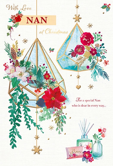 Verse reads: Front - For a special Nan who is dear in every way... Inside - ...this warm and loving wish is sent for a happy Christmas day. So with all the season's greetings this message brings to you, a wish for love and happiness to last the whole year through. For a special Nan With love at Christmas
