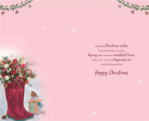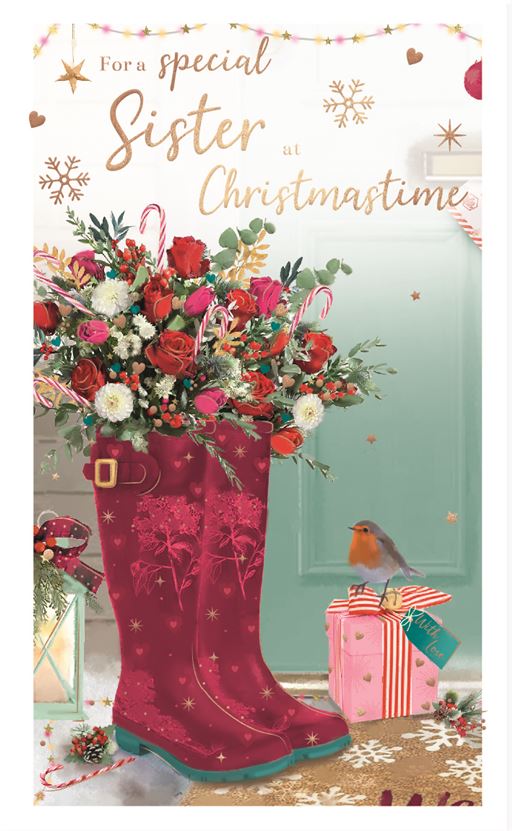 Sister Christmas Card - Red Wellington Boots - Floral - Robin