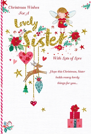 Verse reads: Front - Hope this Christmas, Sister holds many lovely things for you... Inside - Lots of joy and laughter and all the things you like to do. Wishing a wonderful Sister a magical Christmas