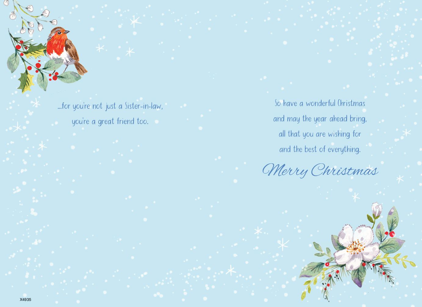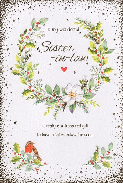 Verse reads: Front - It really is a treasured gift to have a Sister-in-Law like you... Inside -...for you're not just a Sister-in-Law, you're a great friend too. So have a wonderful Christmas and may the year ahead bring, all that you are wishing for and the best of everything. Merry Christmas