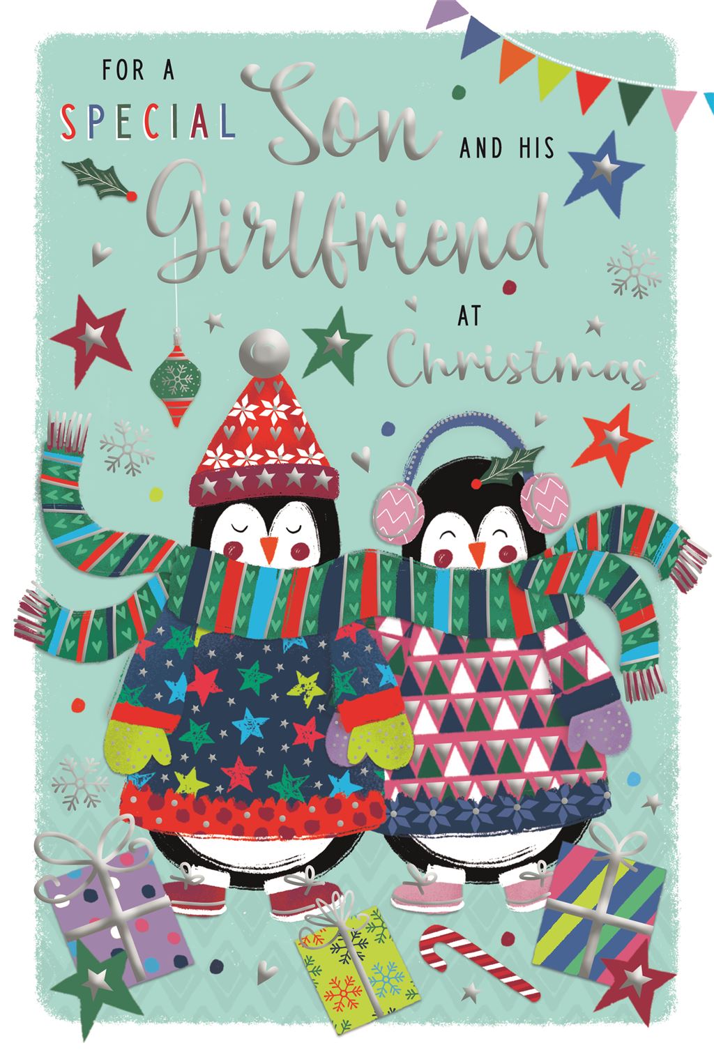 Son and his Girlfriend Christmas Card - Luxury - Penguins Scarves - Multicolour