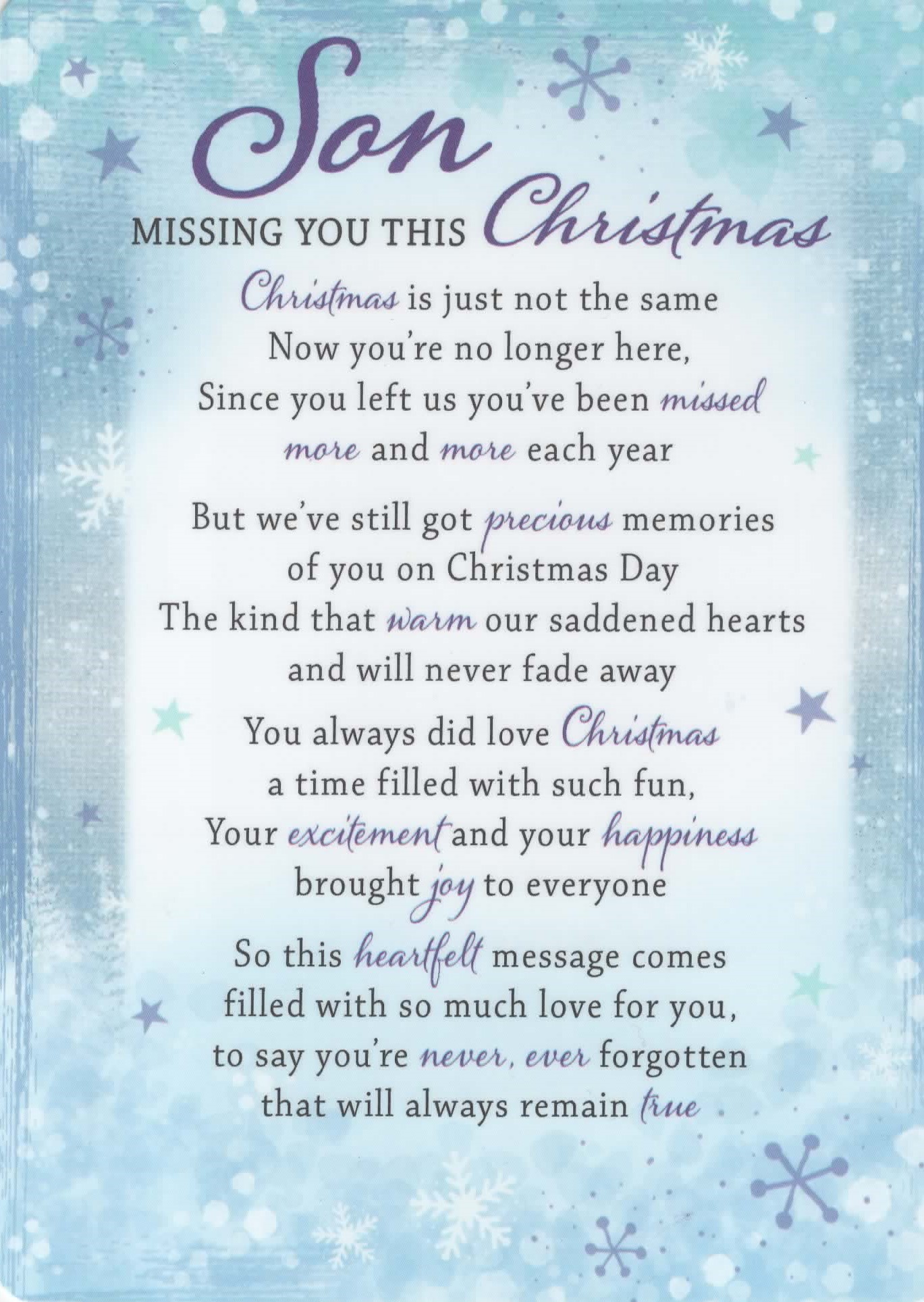 Verse reads: Christmas is just not the same Now you're no longer here, Since you left us you've been missed more and more each year But we've still got precious memories of you on Christmas Day The kind that warm our saddened hearts and will never fade away You always did love Christmas a time filled with such fun, Your excitement and your happiness brought joy to everyone So this heartfelt message comes filled with so much love for you, to say you're never, ever forgotten that will always remain true
