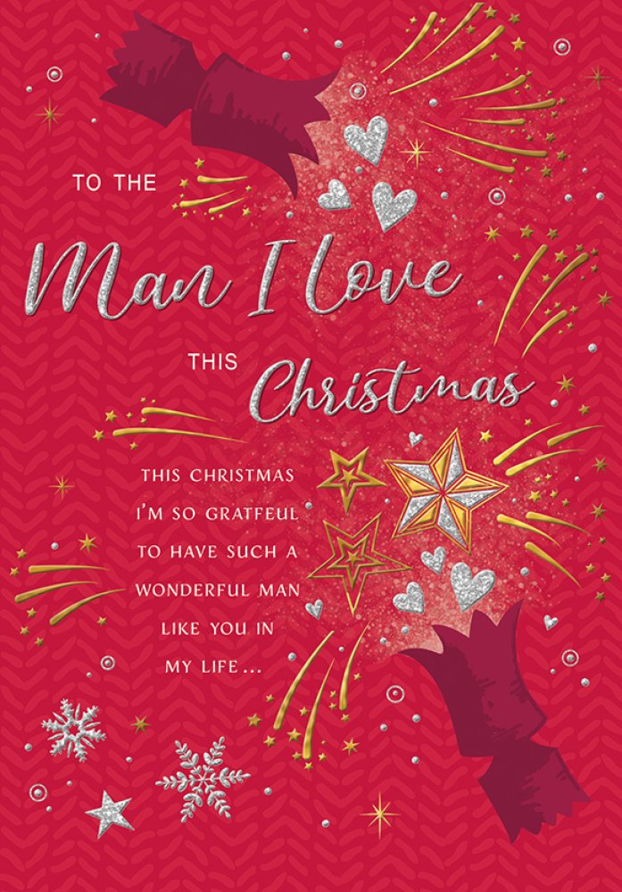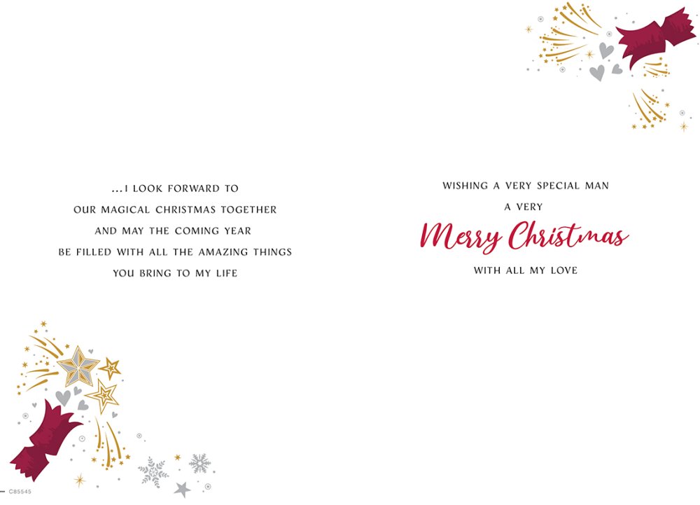 Verse reads: Front - This Christmas I'm so grateful to have such a wonderful man like you in my life... Inside - ...I look forward to our magical Christmas together and may the coming year be filled with all the amazing things you bring to my life Wishing a very special man a very Merry Christmas with all my love
