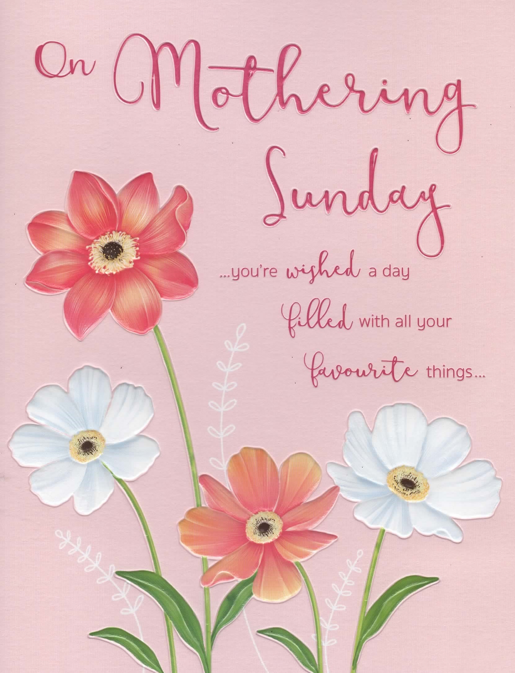 Verse reads: Front - ...you're wished a day filled with all your favourite things... Inside - ...because you are so very special and you deserve a wonderful day Happy Mothering Sunday