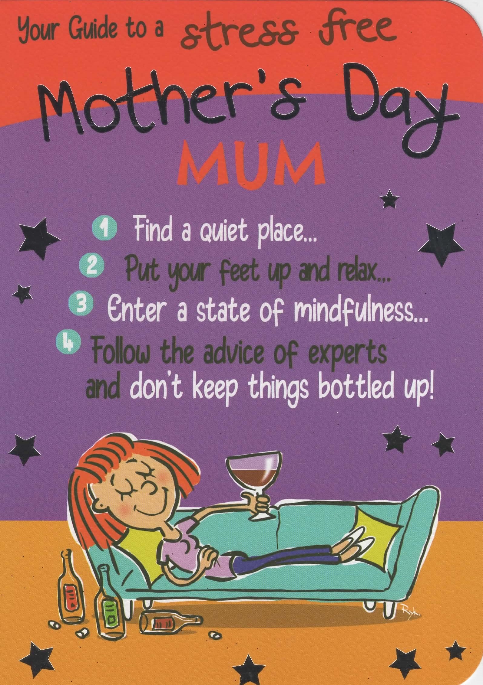 Verse reads: Front - 1. Find a quiet place... 2. Put your feet up and relax... 3. Enter a state of mindfulness... 4. Follow the advice of experts and don't keep things bottled up! Inside - 5. Enjoy your special day! Happy Mother's Day Mum